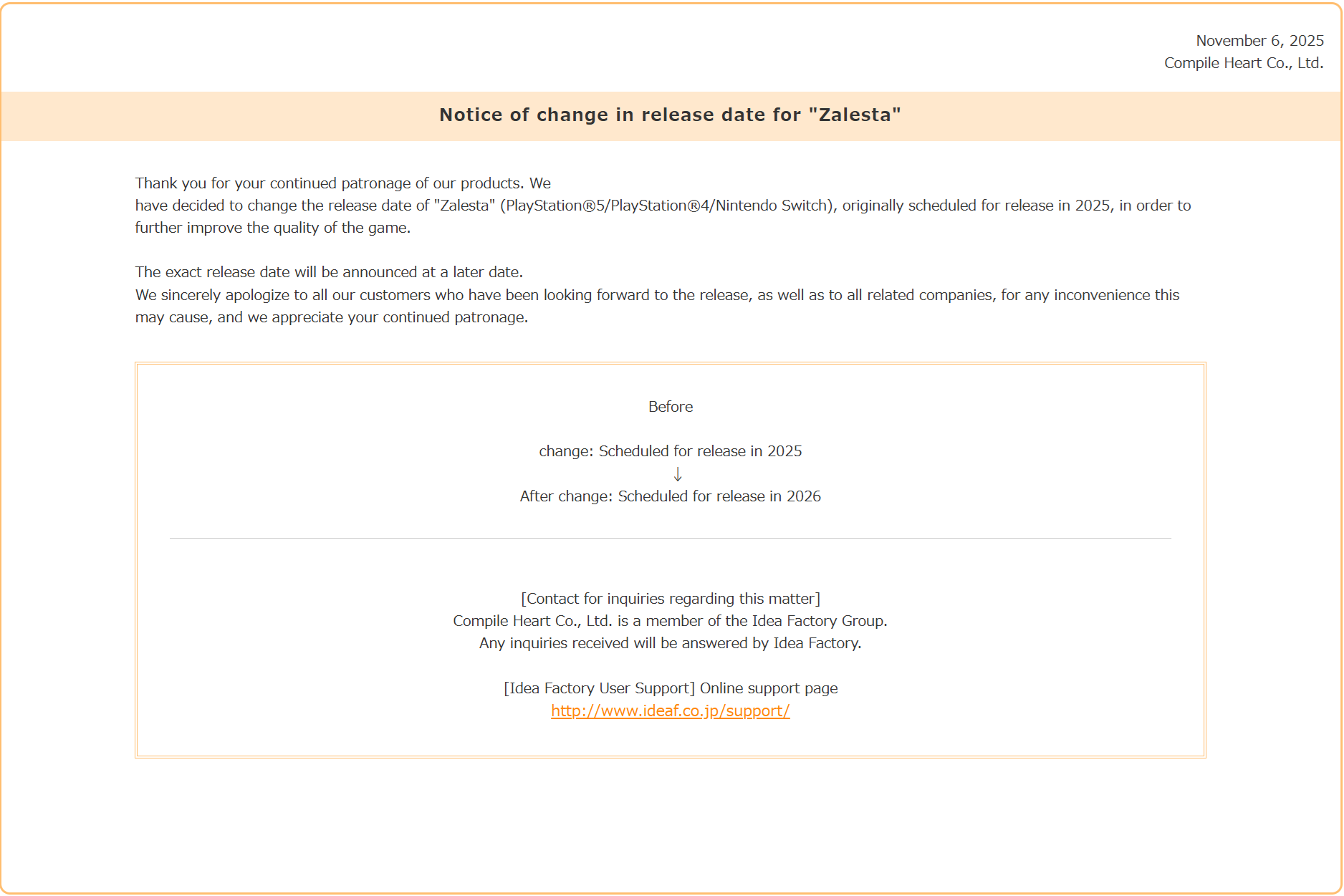 A editora Compile Heart e a desenvolvedora M2 adiaram o lançamento do jogo de tiro Zaleste, que estava previsto para 2025, para 2026 no Japão. O jogo estará disponível para PlayStation 5, PlayStation 4 e Nintendo Switch.