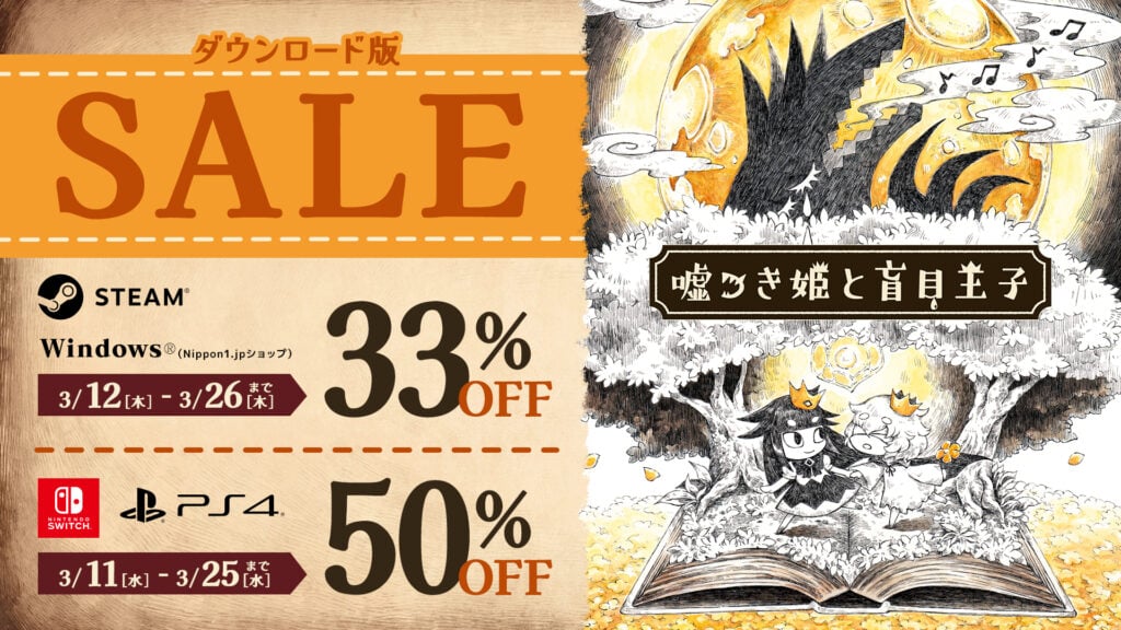 O jogo The Liar Princess and the Blind Prince, que será lançado hoje para PC via Steam, também estará disponível pela Nippon Ichi PC Games. A versão para PC estará com 33% de desconto até 26 de março, enquanto as versões para PlayStation 4 e Switch terão 50% de desconto até 25 de março no Japão.